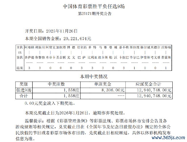 北京期间11月26日,赢输彩第25171期任九开奖恶果揭晓。本期任九开出1558注,单注奖金8306元。本期任九的投注总和为20,221,674元。